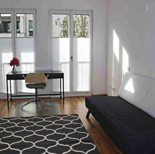 Oberkasselの家具WiFi付2LDK、電気代も込み。EV直通地下駐完備、テラス庭付、清掃サービス付。セキュリティ完備(強化ガラス, 鍵付窓, アラ-ムシステム他) 室内洗濯乾燥機あり、バスタブ付き、ゲストWC、床暖房完備。最寄駅徒歩すぐ、買物に便利な環境