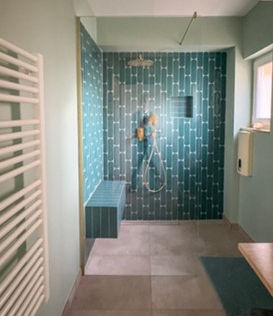 バスタブなしですが、ウォークインタイプのレインシャワーとスタイリッシュなタイルのデザイン。寝室は、ヴィンテージ家具で揃えており、サンルームへのアクセスも可能です。さらに、ウォークインクローゼットと明るいホームオフィスが住空間を充実させています。